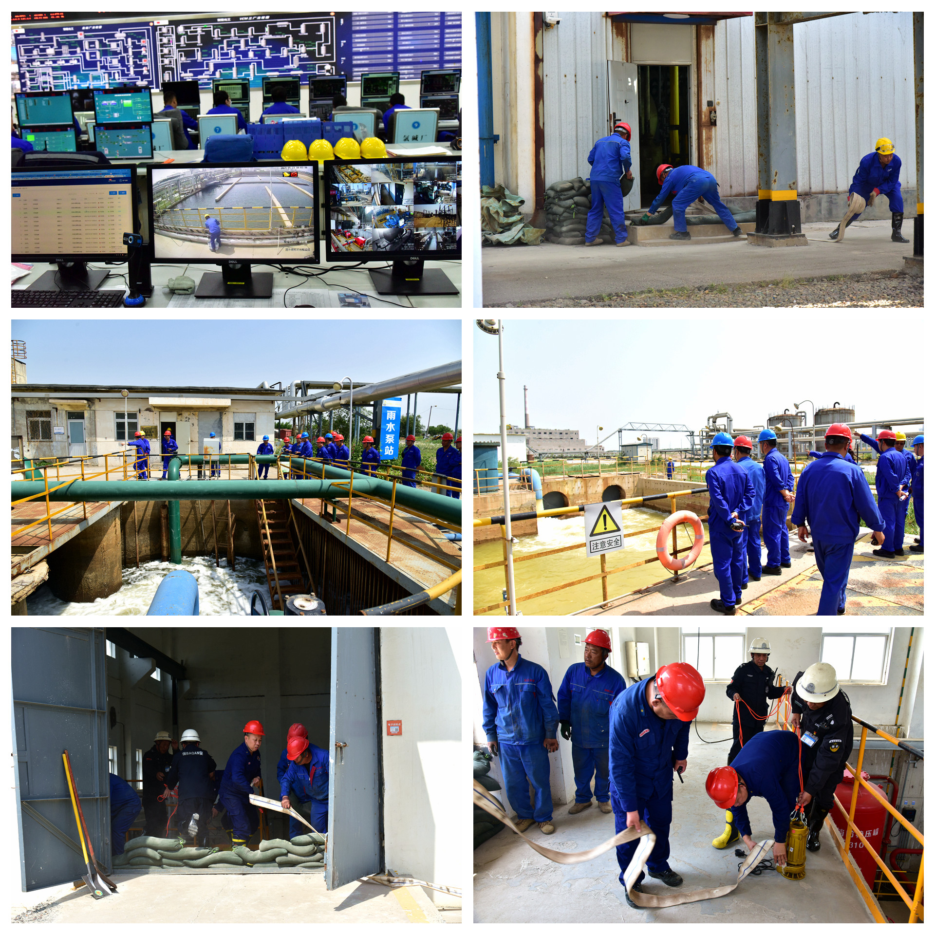 雨季三防指揮部領導前出一線指揮,派出質量管理部化驗人員前往雨水池取樣,在緊急化驗確認雨水匯集池PH值、COD等指標符合排放標準后,命令公用工程廠開啟23萬噸雨水泵及40萬噸雨水泵迅速外排積水;與此同時,氯堿廠、公用工程廠等擁有半地下、地下作業場所的部門,迅速組織突擊隊員在入口處利用防汛沙袋筑建擋水圍堰,防止積水倒灌;演練還模擬個別地下作業場所出現進水緊急狀況,后勤保衛部經警迅速設立警戒區,防止人員誤入觸電,消防隊迅速到場開展救援作業,鋪設消防水籠,接駁潛水泵,電氣部人員為潛水泵做好絕緣措施,接通臨時用電,開展抽水排水作業,確保設備設施安全。至此,演練順利結束。